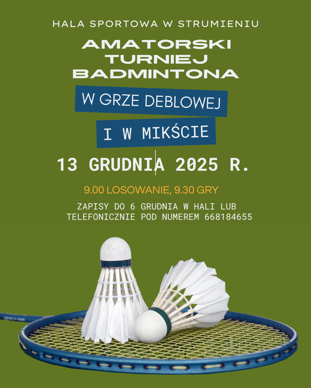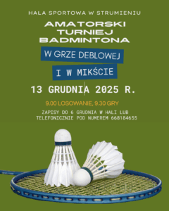 13 grudnia 2025 r. o godz. 9.30 w Hali Sportowej rozegrany zostanie Amatorski Turniej Badmintona w grze deblowej oraz w singlu. (godz. 9.00 losowanie) Zapisy do 6 grudnia br. w hali lub pod numerem telefonu 668184655 Zapraszamy !!!